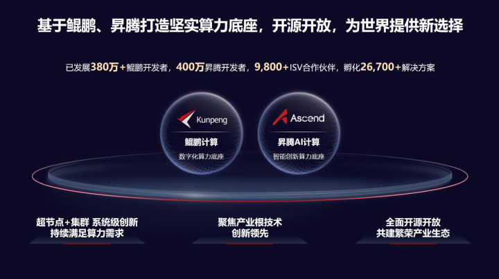 2019年,华为进入计算产业,当时提出了“硬件开放、软件开源、使能伙伴、发展人才”的十六字方针。时隔六年,鲲鹏的注册开发者数达到了约380万,昇腾约有400万,同时,华为还和约9800家ISV伙伴打造了超过2万个解决方案,这些解决方案广泛应用在金融、运营商、能源、制造等领域。
