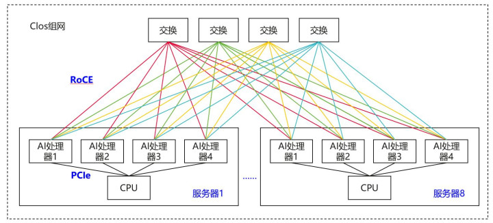 比如下图中,CPU-AI处理器之间通过PCIe互联,AI处理器之间通过RoCE互联,单跳通信时延只能做到微秒级,RTT通信时延会更高,高达几十微秒;假如要从32卡升级到64卡规模,需要增加二层交换,组网复杂;而且不支持内存统一编址,无法做到全局的内存池化以及AI处理器之间的内存语义访问,所有访存都需要通过消息语义通信,优化存在瓶颈。