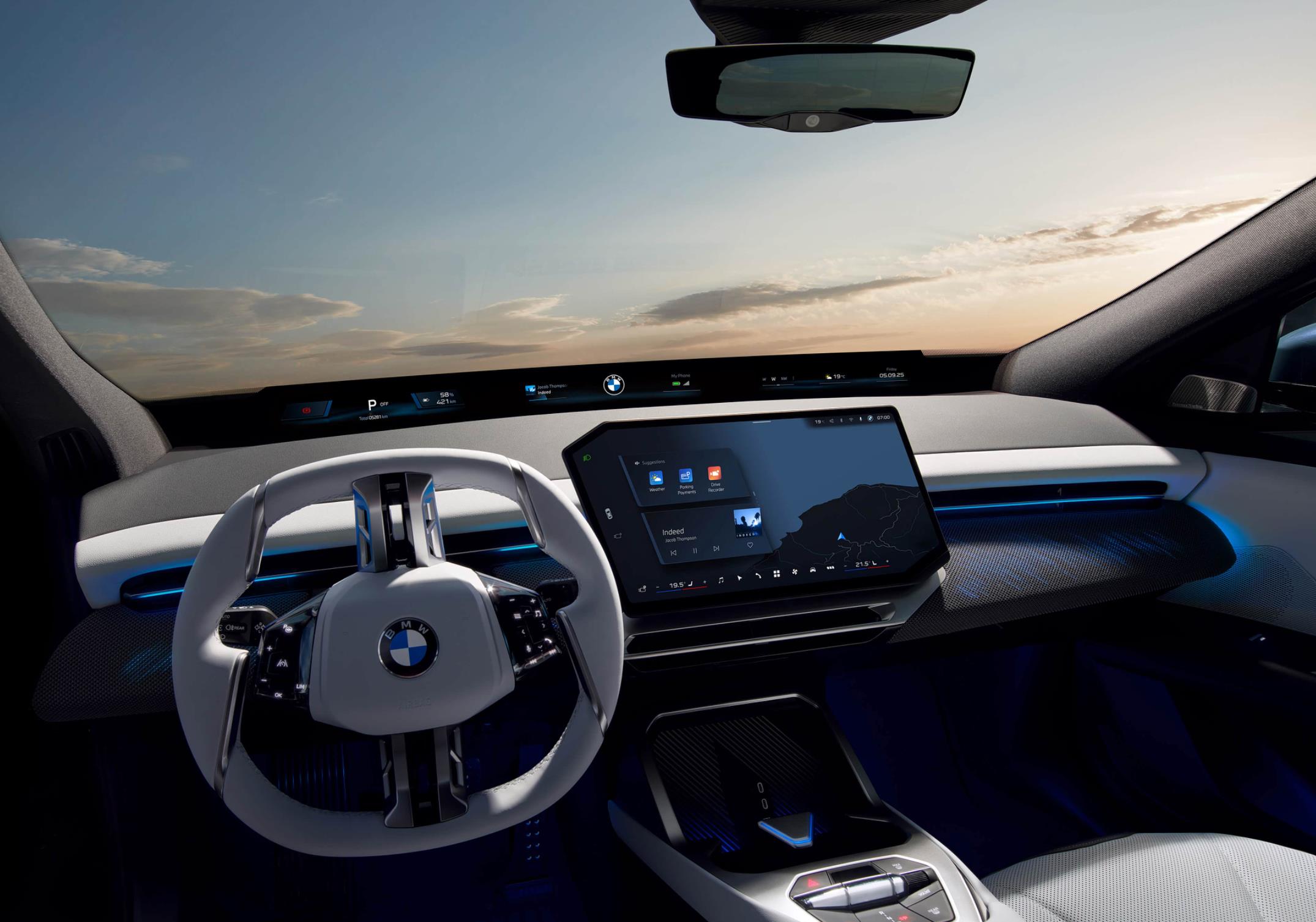 进入车内,宝马iX3车内的采光更好,宽敞明亮,得益于该车配备的全景一体式防晒天幕和四周宽大的侧窗、前风挡玻璃和尾窗,整车采用了大面积Alcantara面料包裹,浅灰色和浅棕色的交替搭配,再加上蓝色的安全带,十分柔软细腻。中控台配备了12.3英寸全液晶仪表盘和14.9英寸悬浮式中控屏,按键数量减少约50%,六角形的方向盘搭配着换挡拨片,再加上精致小巧的换挡拨片,科技感和运动感丝毫不差。还加入了全景视域桥、新世代操作系统X以及视平线全景显示系统,并引入与阿里巴巴共同开发的宝马定制大语言模型(LLM)技术,DeepSeek的AI大模型能力以及AI智能体引入座舱,同时系统支持鸿蒙生态,HUAWEI HiCar等数字化服务。